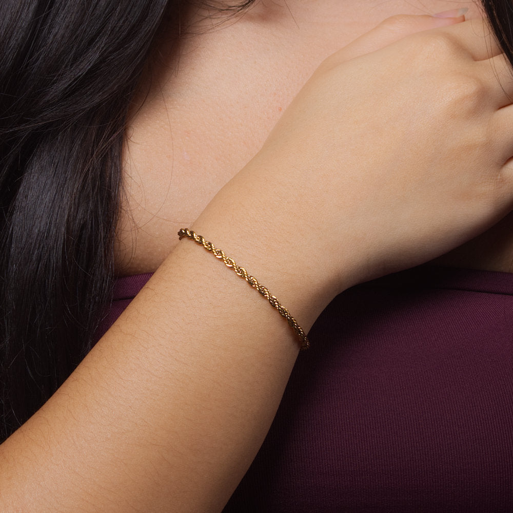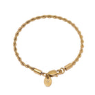 Deze prachtige 3mm brede rope armband is verguld met hoogwaardig 18-karaats goud, wat zorgt voor een warme, rijke uitstraling en duurzaamheid. Het verfijnde vlechtpatroon biedt niet alleen een elegante look, maar versterkt ook de stevigheid van de ketting.