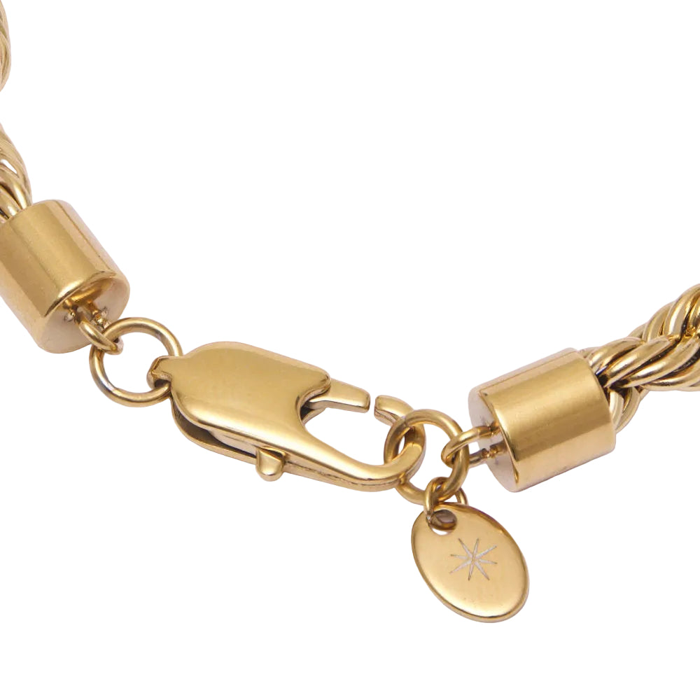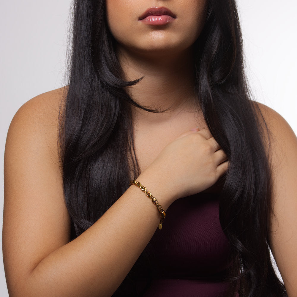 Deze prachtige 6mm brede rope armband is verguld met hoogwaardig 18-karaats goud, wat zorgt voor een warme, rijke uitstraling en duurzaamheid. Het verfijnde vlechtpatroon biedt niet alleen een elegante look, maar versterkt ook de stevigheid van de ketting.
