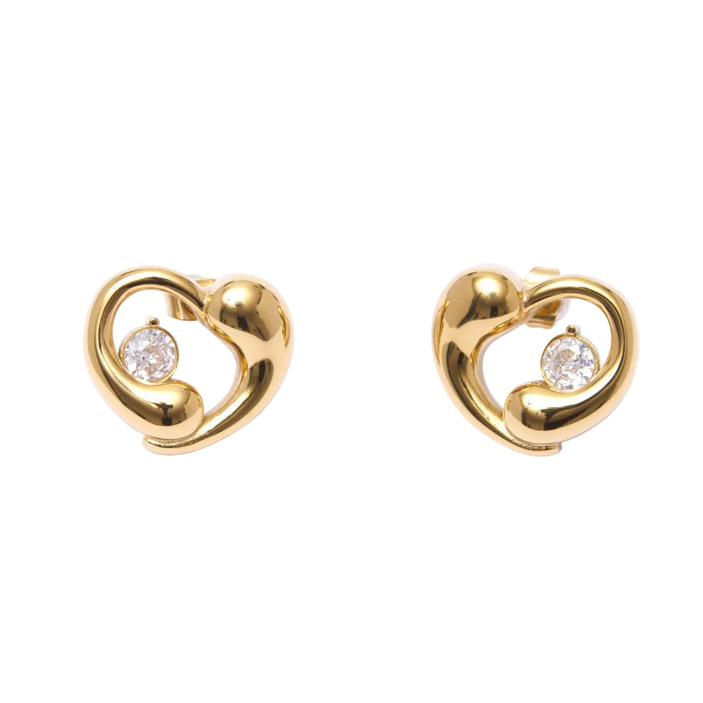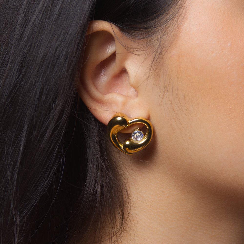 Een fijn, perfect gevormd hartje dat zacht tegen je oorlel rust, alsof het er altijd al hoorde. In het centrum schittert één handgezette 5A CZ zirconia, rond-briljant geslepen, zo loepzuiver en vurig dat het lijkt alsof er een mini-sterrenhemel in zit. Warm 18K goud plating geeft het geheel die zwoele gloed die je overal herkent – van Amsterdam tot Bali.