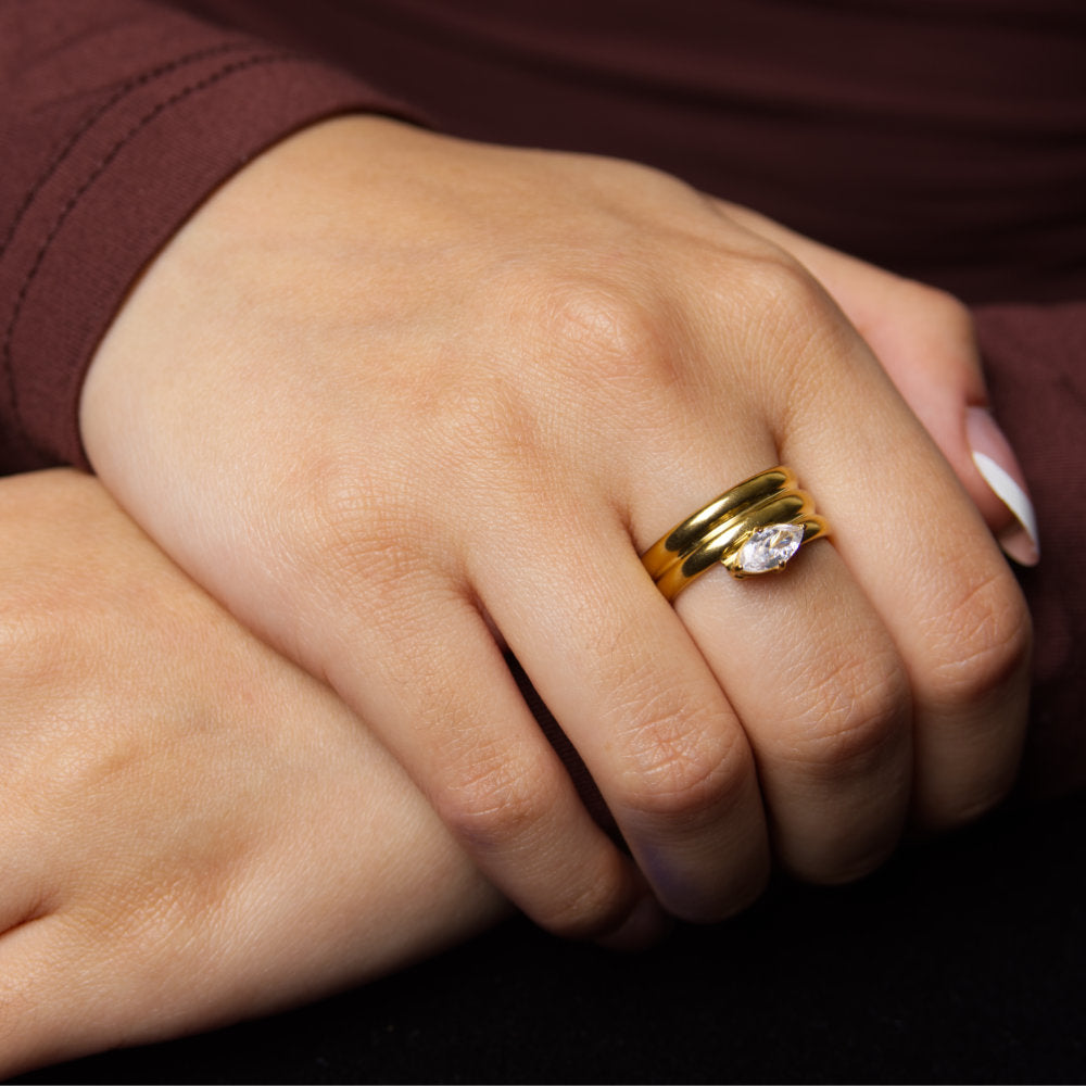 Deze verfijnde 18-karaats gouden ring opgebouwd uit drie lagen en 5A zirconia steen symboliseert onwrikbaar vertrouwen - in jezelf, je relaties en je dromen. Meesterlijk vakmanschap gecombineerd met duurzame kwaliteit voor een tijdloze uitstraling.