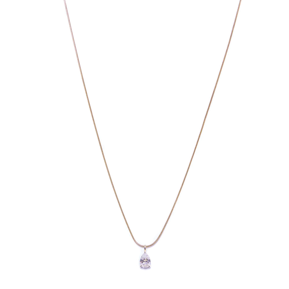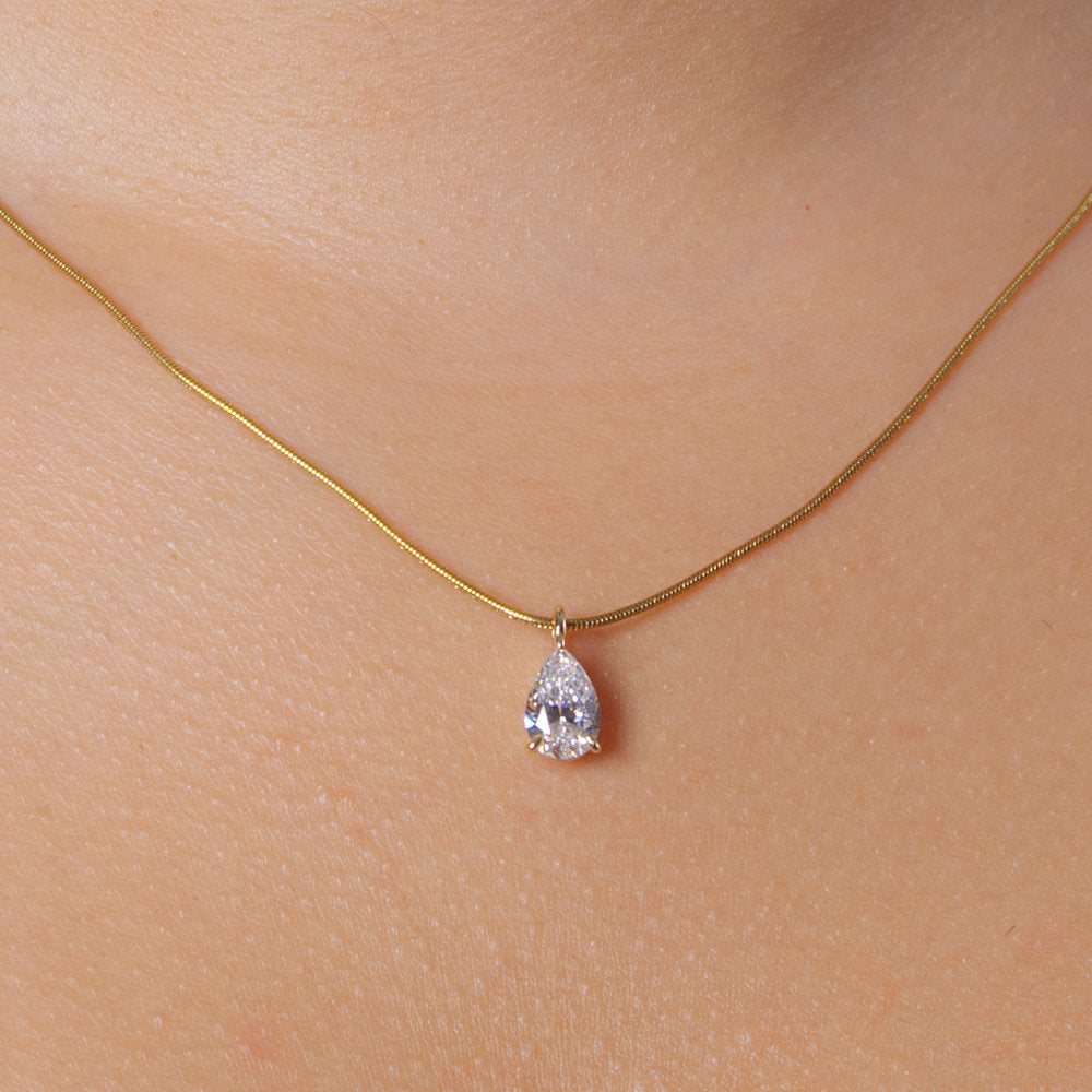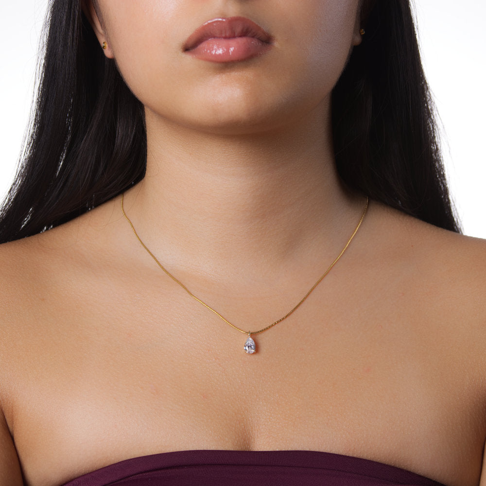 Een sieraad met koninklijke allure: de KATHARINE is een ultrafijne gouden ketting met één perfect gezette VVS CZ traansteen van de allerhoogste kwaliteit. De teardrop-vormige steen schittert helderder en intenser dan de meeste echte diamanten en beweegt subtiel mee met elke beweging – puur vakmanschap in zijn elegantste vorm