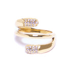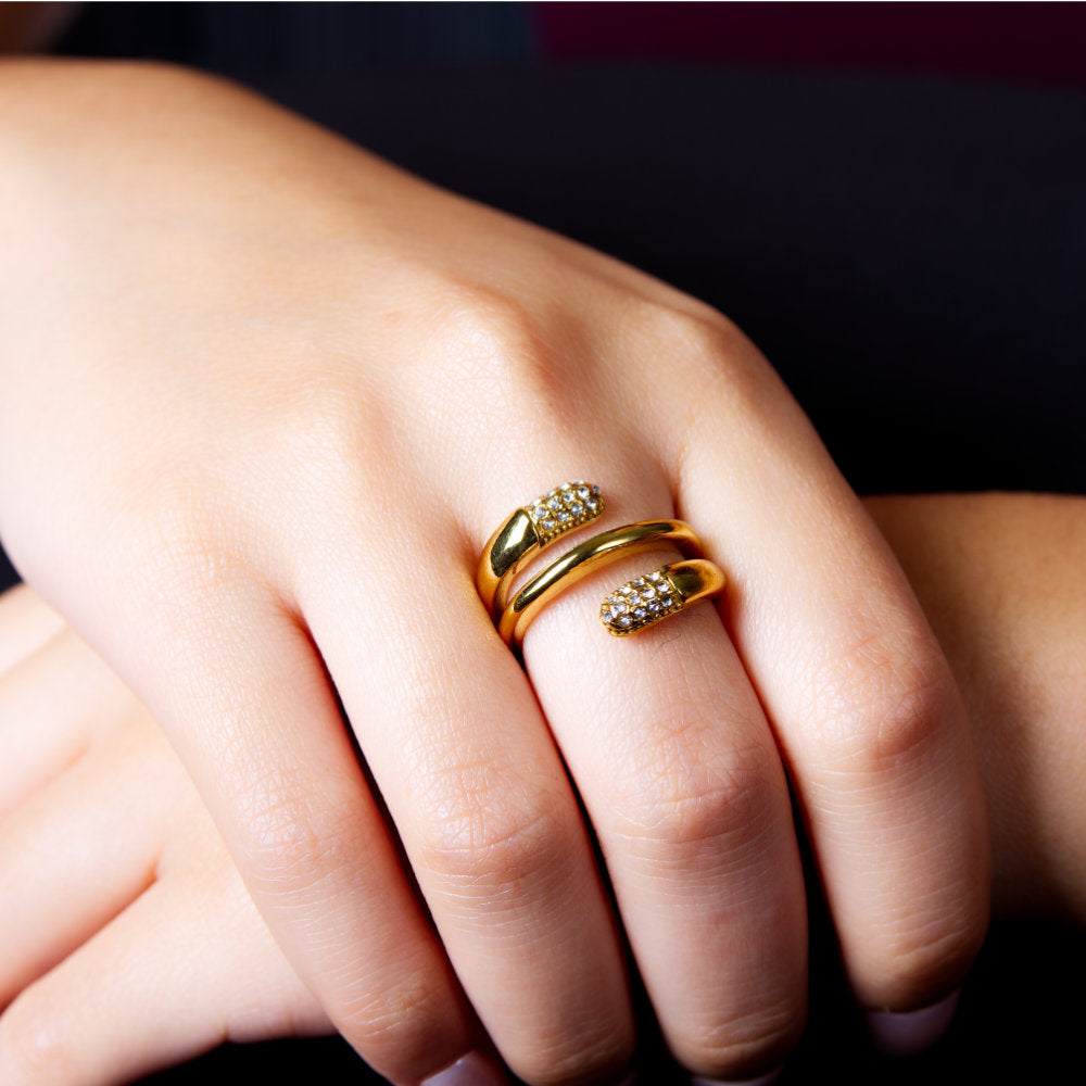 Een vloeiende, open spiraal van warm 18K goud die zich zachtjes om je vinger kronkelt alsof hij daar altijd al thuishoorde. Aan beide uiteinden fonkelen twee subtiele banen van handgezette 5A cubic zirconia: klein genoeg om ingetogen te blijven, fel genoeg om het licht overal mee naartoe te nemen. Verkrijgbaar in drie maten.