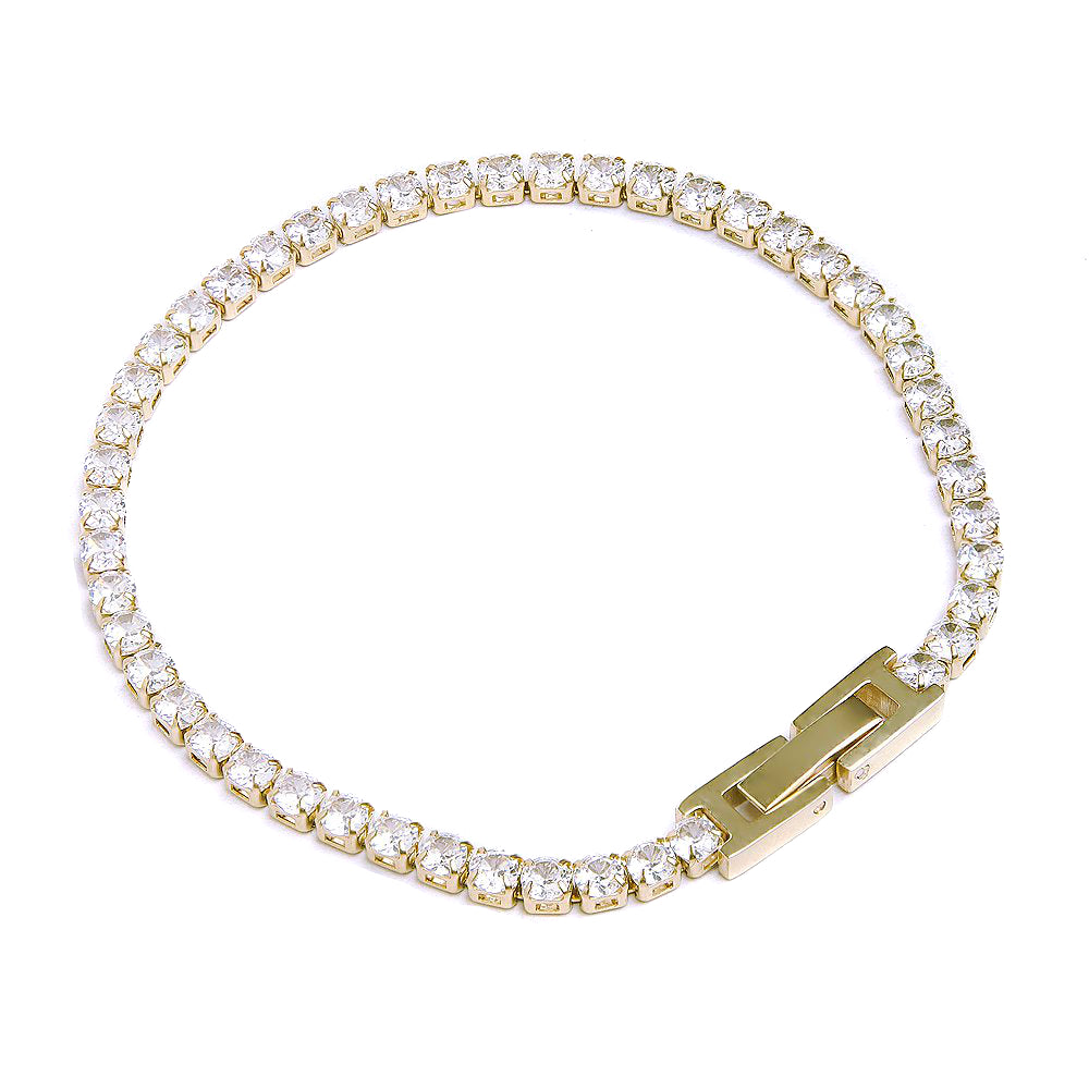 Ontdek de perfecte mix van luxe en subtiliteit met de DAMON tennisarmband met veilige en luxe box-sluiting. Deze klassieke 3mm gold plated armband is volledig bezet met sprankelende, handgezette VVS CZ 5A zirconia stenen die een ongeëvenaarde schittering geven – nét alsof je een echte diamanten tennis bracelet draagt, maar dan voor een fractie van de prijs.