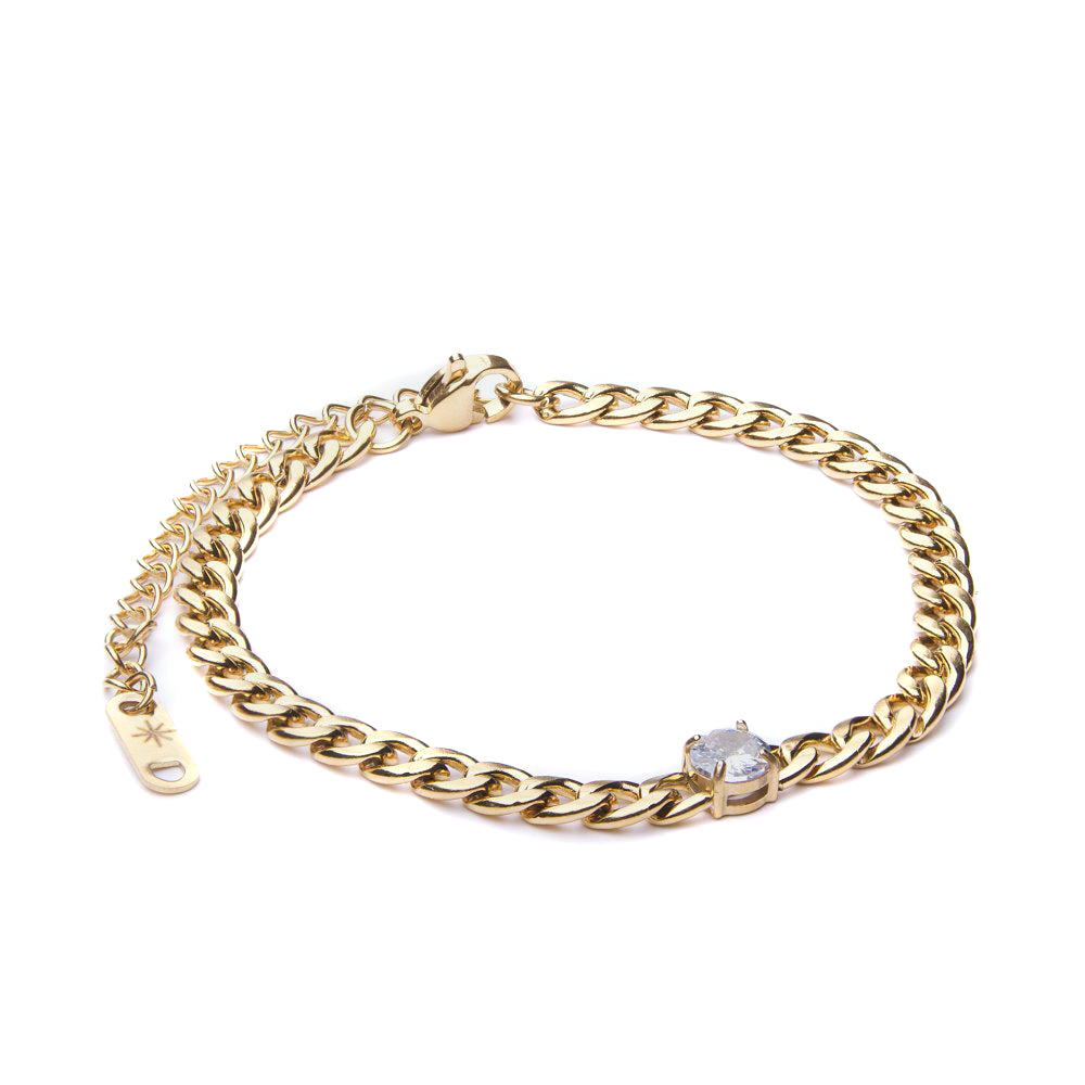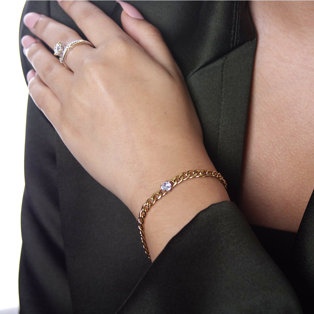 Deze elegante armband met fijne schakel en schitterend zirkonia steentje voegt subtiele glamour toe aan elke outfit. De delicate schakel zorgt voor een comfortabele pasvorm en tijdloze uitstraling. Perfect voor dagelijks gebruik of speciale gelegenheden.