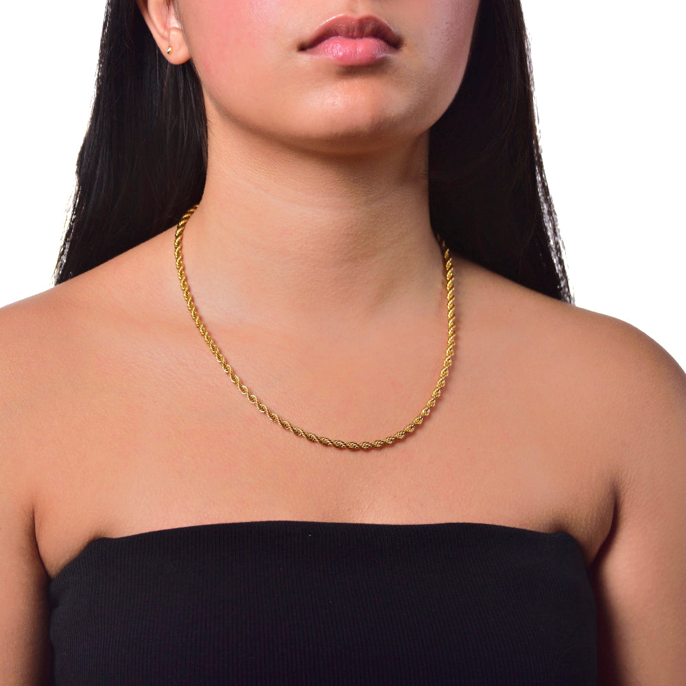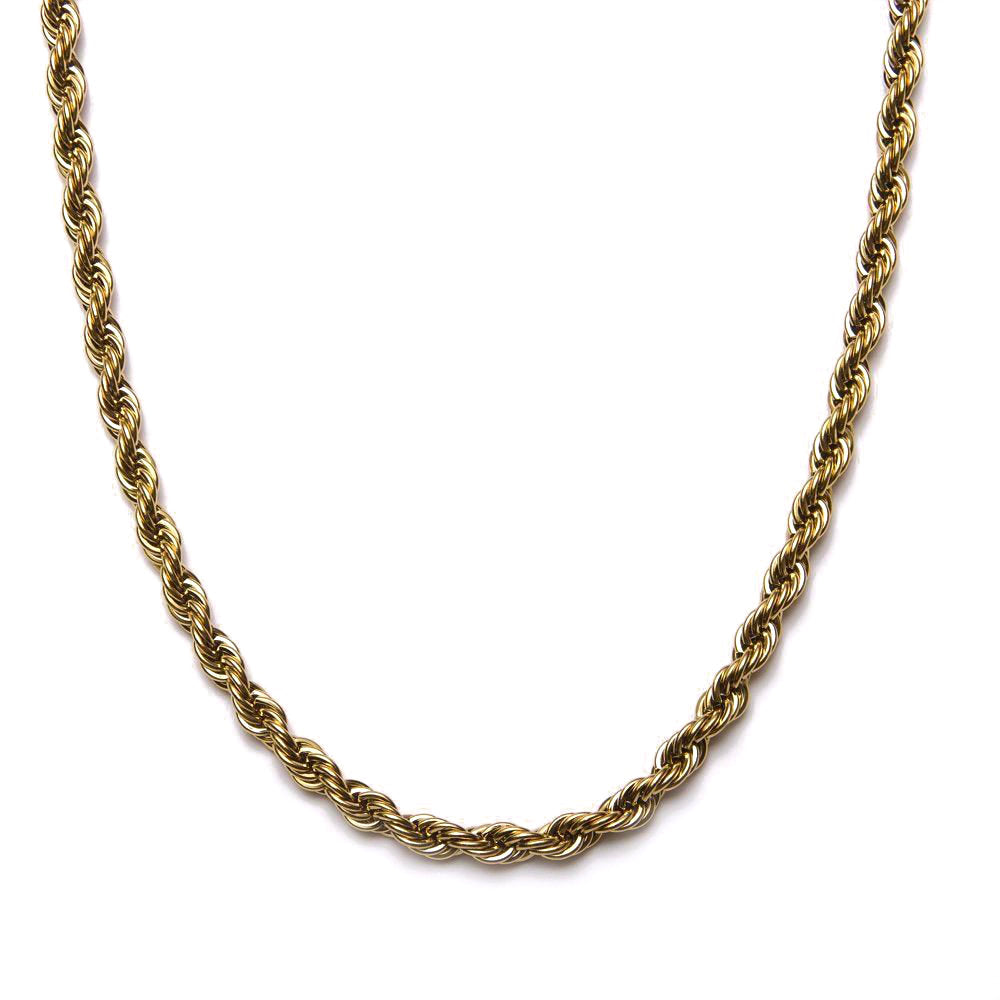 Deze prachtige 4mm brede rope ketting is verguld met hoogwaardig 18-karaats goud, wat zorgt voor een warme, rijke uitstraling en duurzaamheid. Het verfijnde vlechtpatroon biedt niet alleen een elegante look, maar versterkt ook de stevigheid van de ketting.